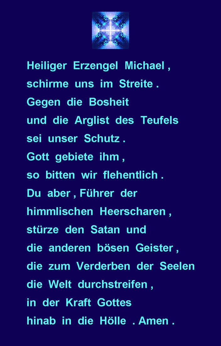 „Heiliger Erzengel Michael, verteidige uns im Kampfe. Gegen die Bosheit und die Nachstellungen des Teufels sei du unser Schutz. Gott gebiete ihm, so bitten wir flehentlich. Und du, Fürst der himmlischen Heerscharen, stürze den Satan und die anderen bösen Geister, die zum Verderben der Seelen die Welt durchstreifen, mit der Kraft Gottes hinab in den Abgrund der Hölle. Amen.“